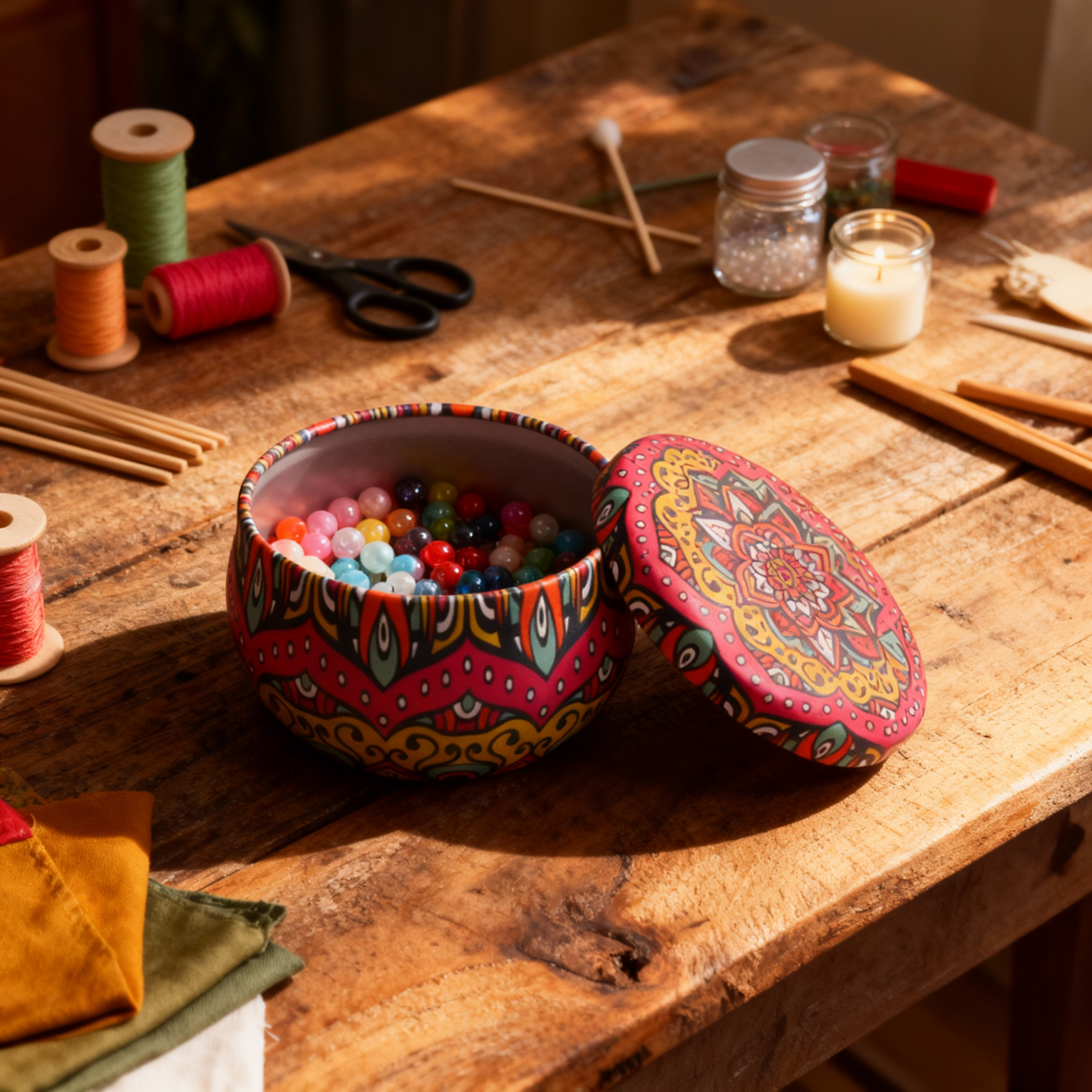 علبة صفيح صغيرة باللون الوردي مع أصفر متعدّد الألوان، سعة 50 مل، مقاس 3.8 × 6.2 سم.
