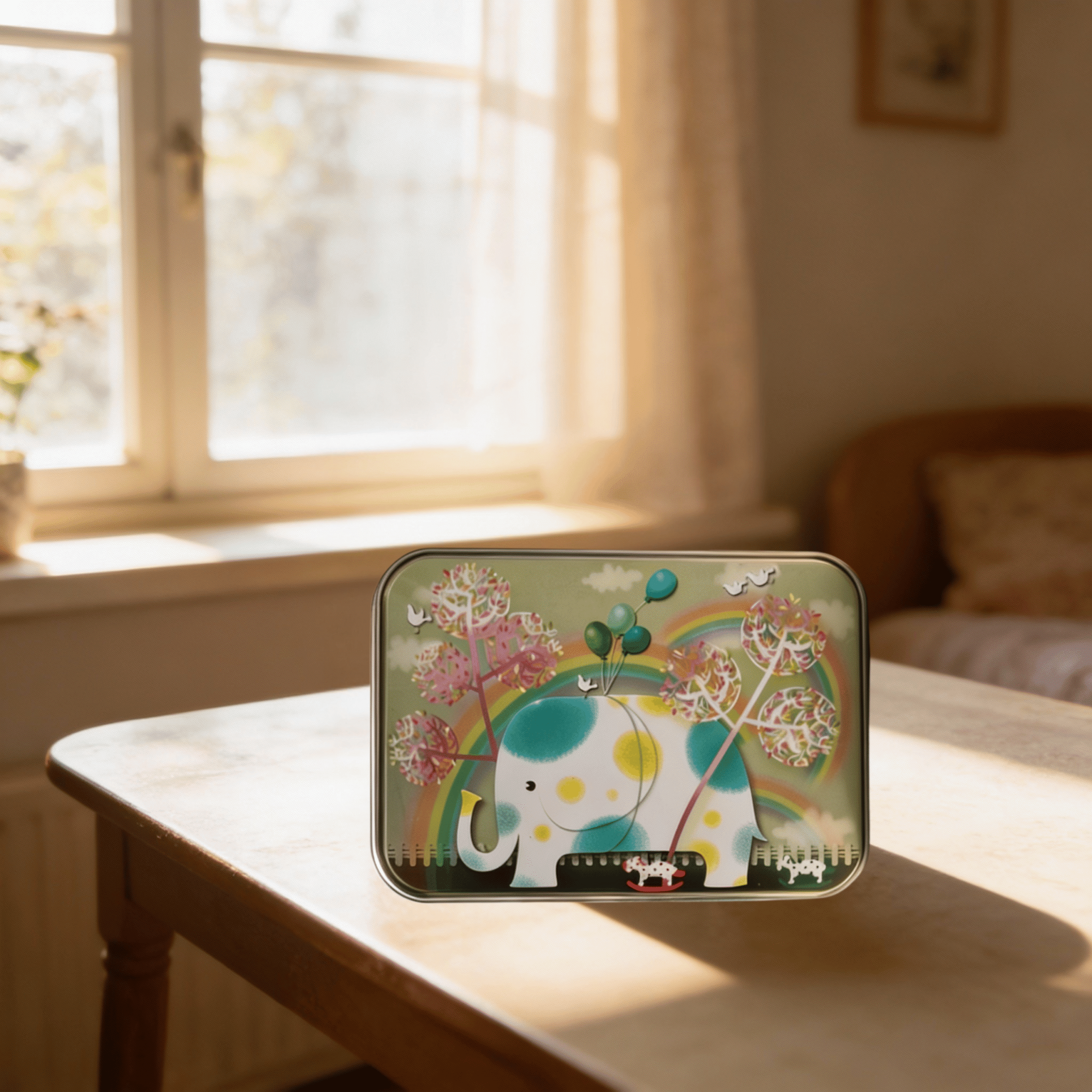 This silver metal tinplate storage container features a green decorative lid with an elephant design, offering a playful, charming, and collectible aesthetic. With a 100-gram capacity and compact dimensions of 2.5 × 6.5 × 9 cm, it is perfect for storing candles, wax, beads, jewelry, small crafts, and keepsakes.