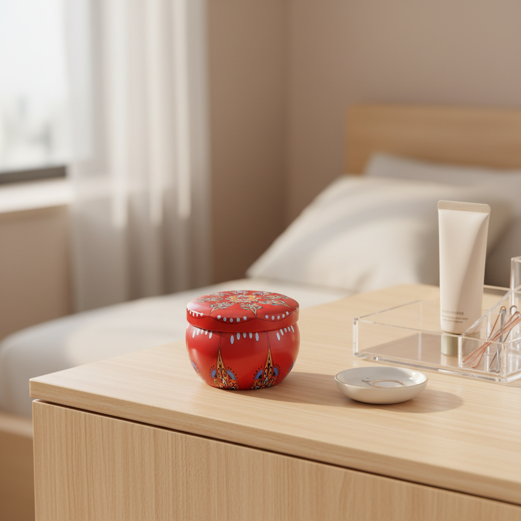 Keep your small essentials neatly organized with this tinplate metal storage container featuring a decorative Mandala design. Designed with a rich red base and subtle blue and light orange patterns, this storage tin adds a warm decorative accent while remaining practical for everyday use. Its compact dimensions (7.5 × 5 cm) and 100g capacity make it ideal for storing candles, beads, jewelry, accessories, crafts, and other small items. Made from durable metal, it helps protect contents from dust while keeping your space tidy and stylish. Perfect for desks, shelves, vanities, or as a decorative gift, this Mandala metal storage tin combines functionality with artistic appeal. It is Key Features: Durable tinplate metal storage container, Red base with small blue & light orange Mandala design, Suitable for candles, beads, jewelry & accessories, Dimensions: 7.5 × 5 cm, Capacity: 100 grams, and Decorative and functional organizing solution.