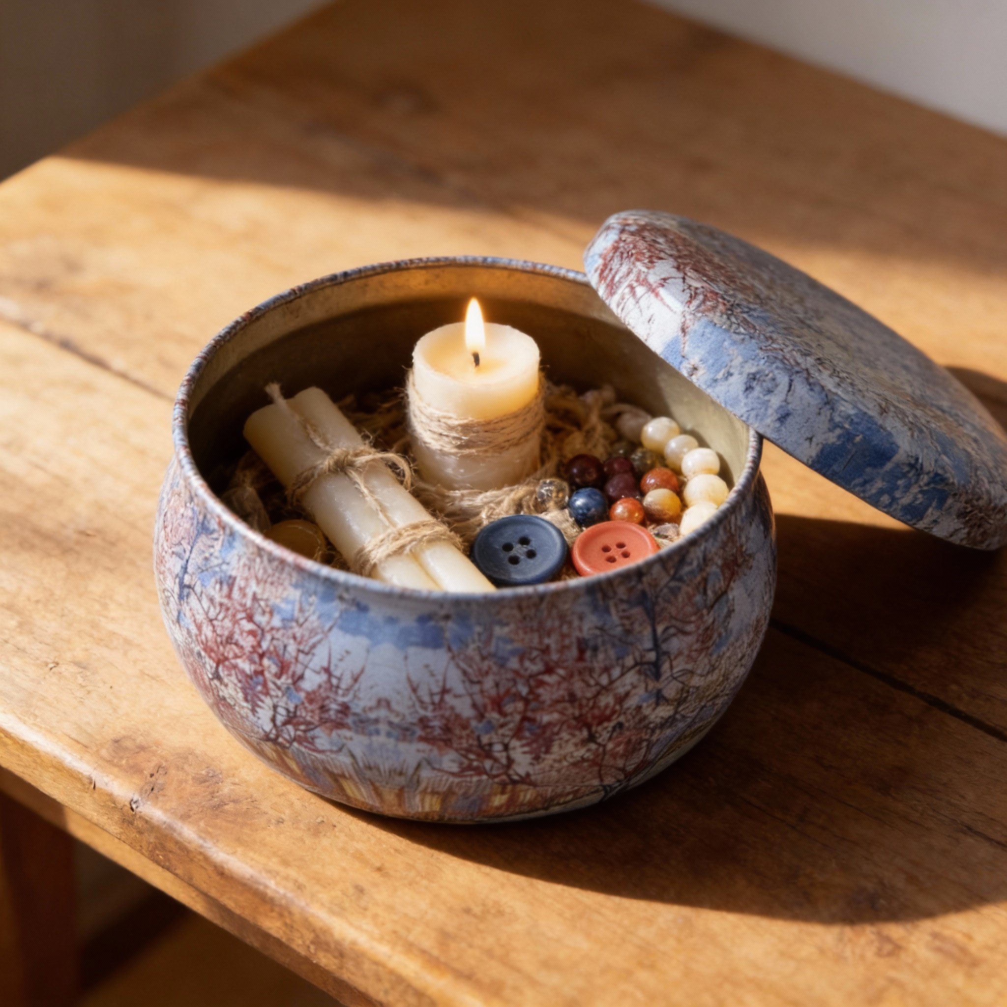 Bring seasonal charm and practical organization into your space with this blue tinplate storage container featuring a beautiful tree design inspired by autumn. Crafted from durable, high-quality tinplate, this metal container is lightweight yet sturdy, making it perfect for storing candles, wax, beads, buttons, accessories, and small craft supplies.