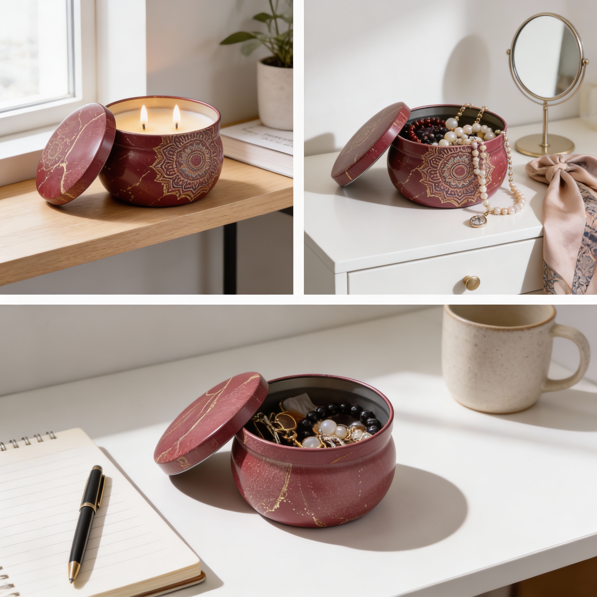 Be the first to review “Mandala Metal Storage Tin 7.5 × 5 cm – Tinplate Organizer with Marble Mandala Design for Candles, Beads & Accessories (100g)”